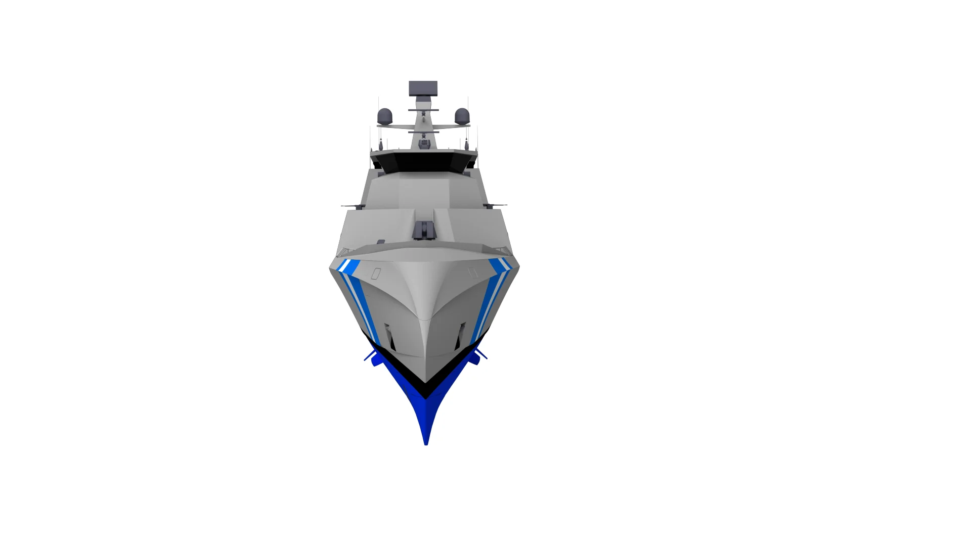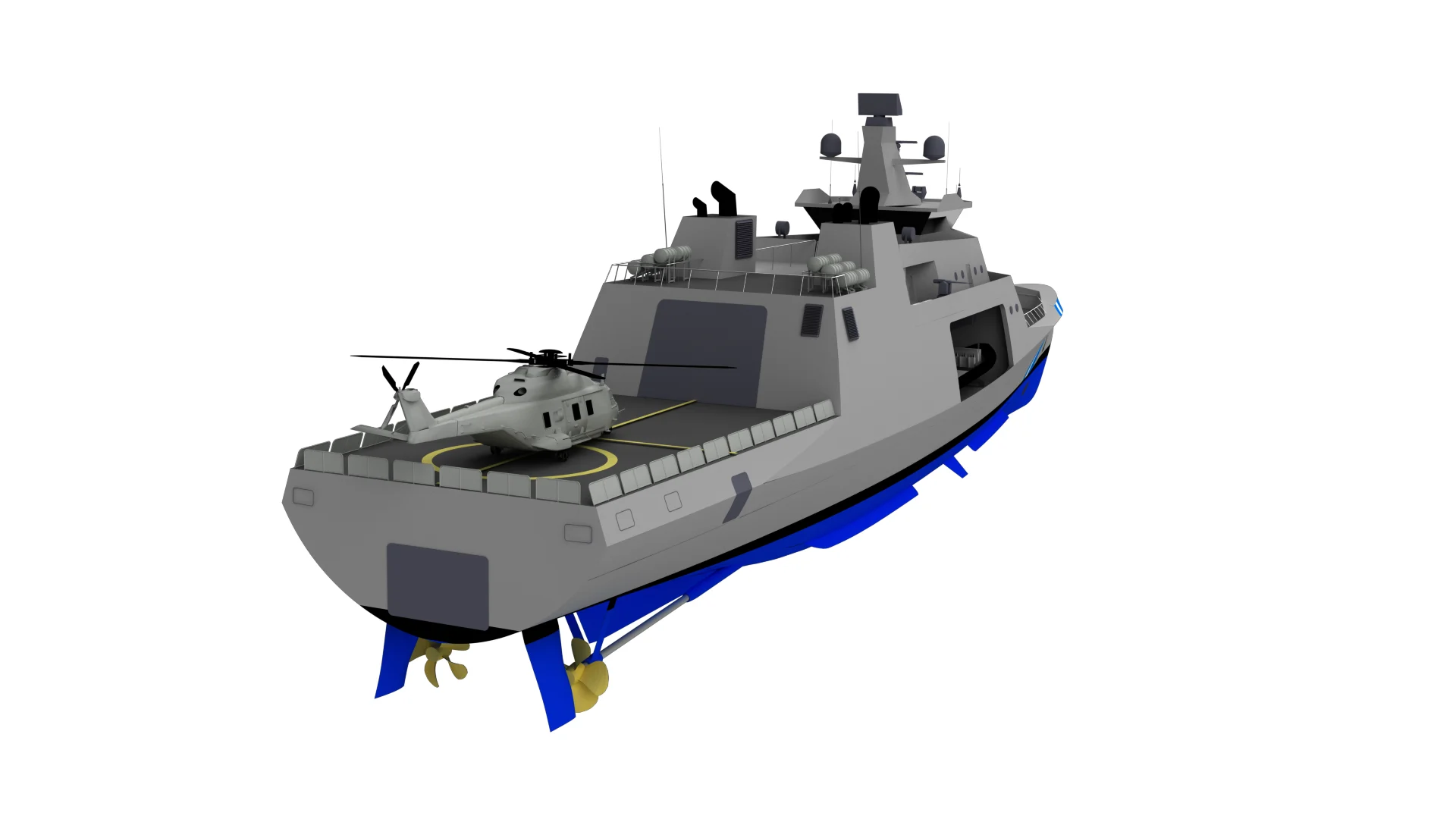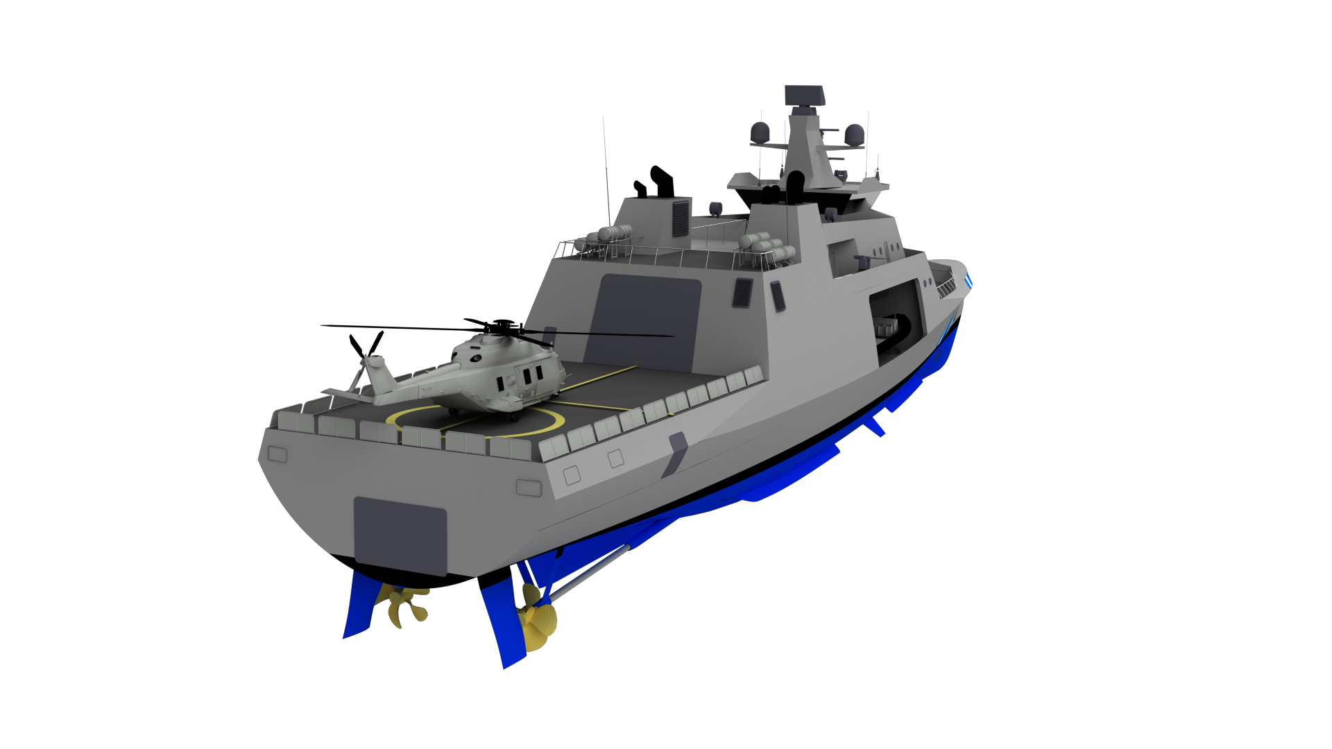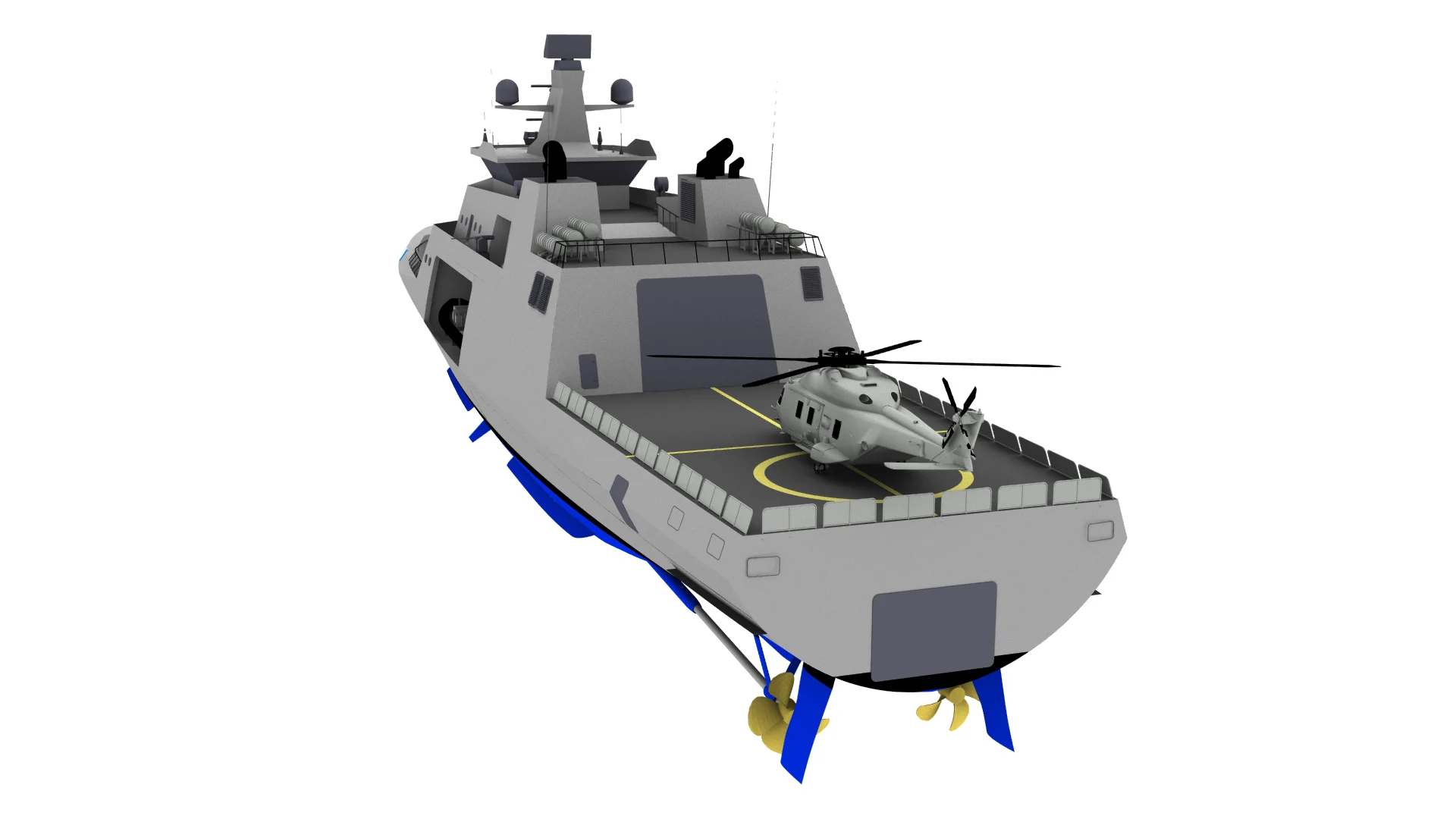 Based on a requirement for an Offshore patrol vessel, available corvette design has been tailored to create a new vessel design. Additional features include helicopter hangar, two auxiliary 9m boats, Aft and side rescue/boarding area and two side thrusters.